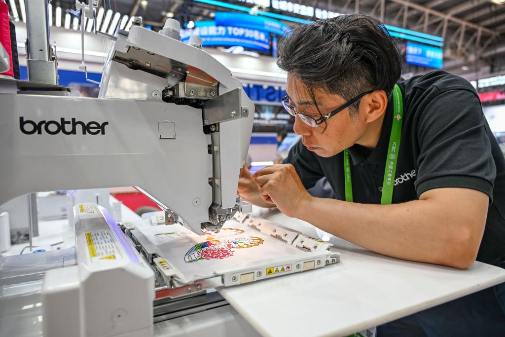 7月16日,工作人员在链博会先进制造链展区调试兄弟(中国)商业有限公司研发的商用绣花机。新华社记者 陈朔 摄