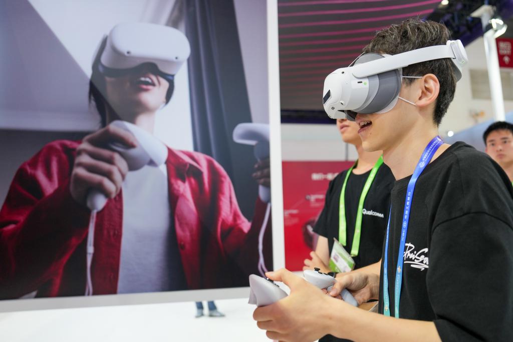 7月17日,参观者在数字科技链展区高通展台体验搭载了高通公司芯片的产品。新华社记者 鞠焕宗 摄